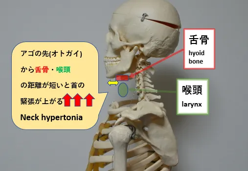 食べ物を良く噛んで飲み込む事や、また声を出しやすい状態にする為には、顎と喉仏の間は距離が長く緩んでいる状態の方が、筋肉が働きやすい理想的な状態と言えます。