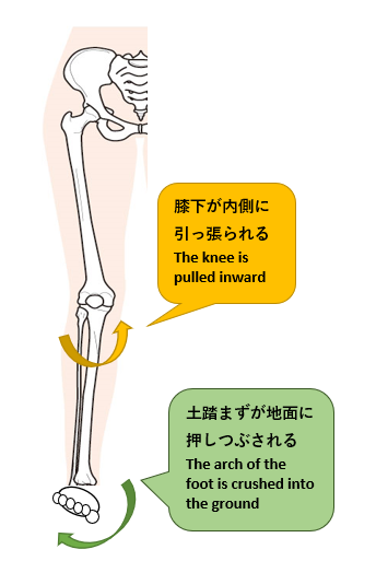 膝下が内側に引っ張られる土踏まずがつぶれる