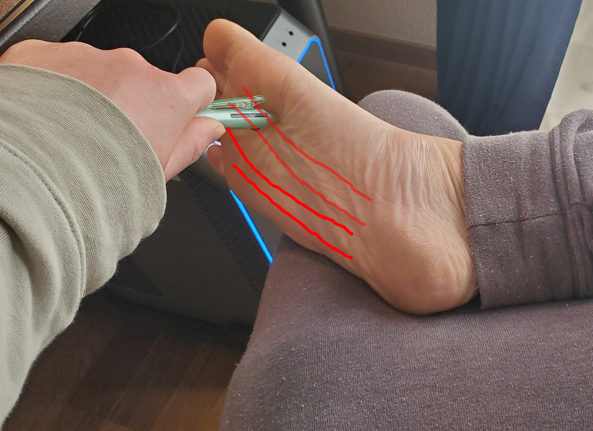 赤い線に沿って骨の間をマッサージしていく。足の甲からも行うと良い。
