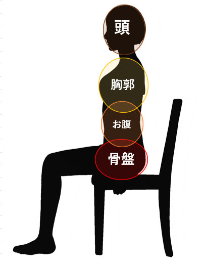 仙骨座りではお腹・胸郭・頭の部位が、下の部位の上にまっすぐに乗っていないため、真ん中に引き戻す様な力が入ってします。