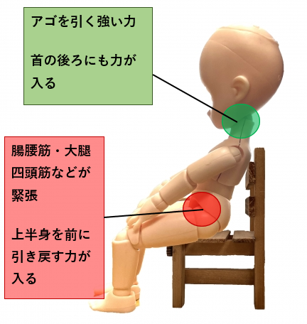 この姿勢では、必然的に座面は仙骨座りとなり、また背中と足で床を押す力が無意識に入ってしまいます。